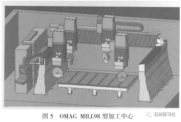 由于有關(guān)技術(shù)和關(guān)鍵的問(wèn)題還未得到完全徹底解決,故在國(guó)內(nèi)石材加工中還沒(méi)得到廣泛應(yīng)用,也顯著提高了石材制品的加工效率。圖5為意大利OMAG公司的MILL98型加工中心工作模擬圖,該加工中心同時(shí)配備了4個(gè)工作頭。