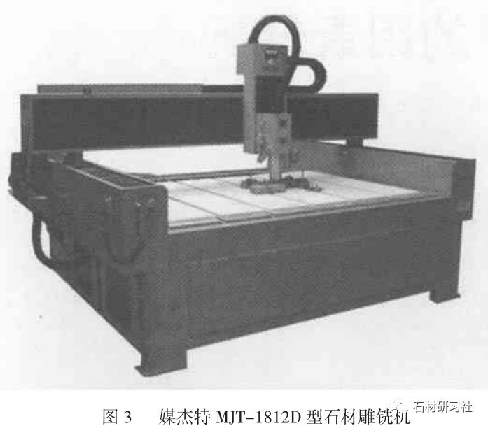 圖3為國(guó)產(chǎn)美杰特MJT-1812D型石材雕銑機(jī)主 要用于墓碑加工,其最大加工尺寸為:寬2700mm、 長(zhǎng)2100mm、高1800mm,最大加工質(zhì)量為: 1500kg。