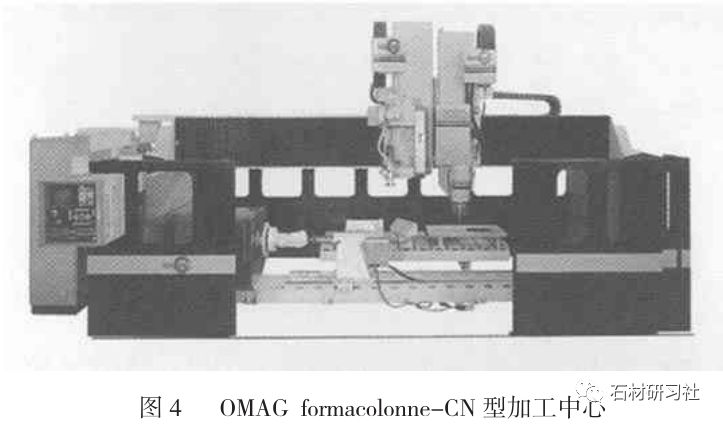 圖4 為意大利OMAG公司設(shè)計(jì)的formacolonne--CN型加工中心,該加工中心采用4軸聯(lián)動(dòng)數(shù)字控制加工技術(shù), 同時(shí)配有兩個(gè)工作頭。